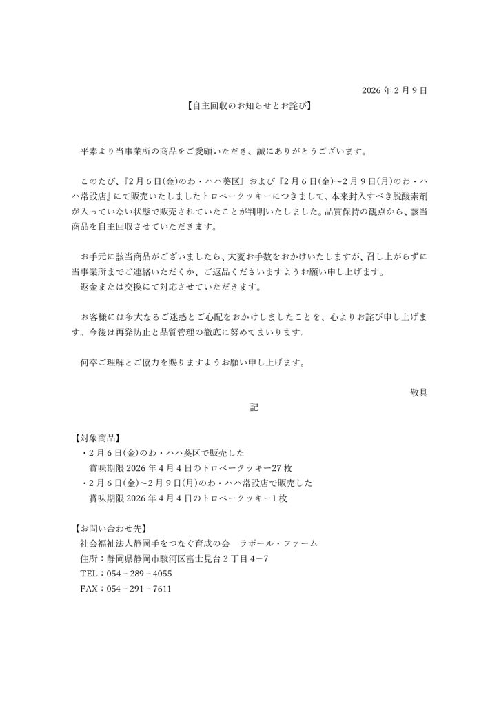 今後は再発防止と品質管理の徹底に努めてまいります。
